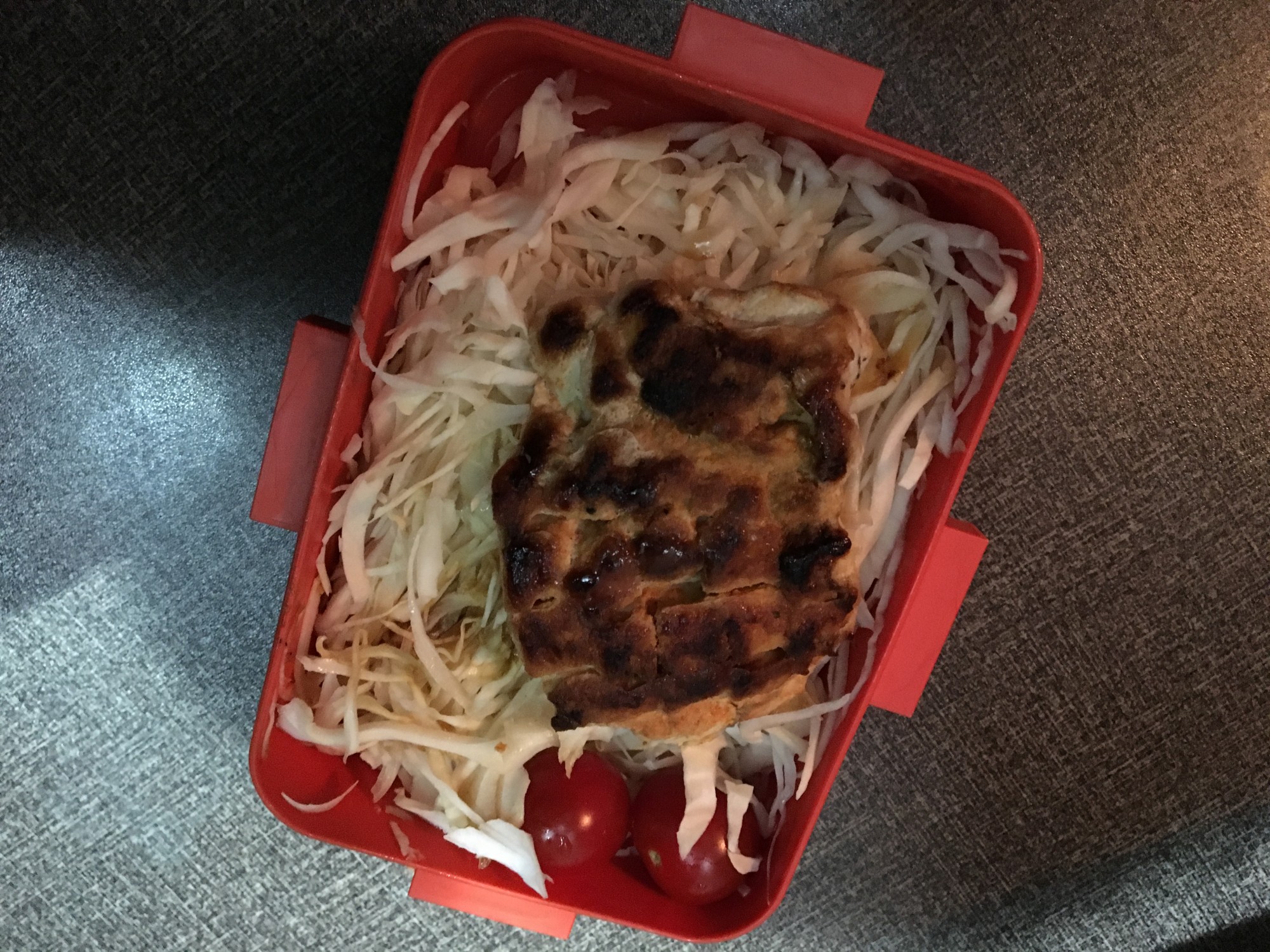 僕が今、お昼ご飯に食べている鶏のむね肉とキャベツです。早くおいしいおにぎりをおなか一杯食べたいな