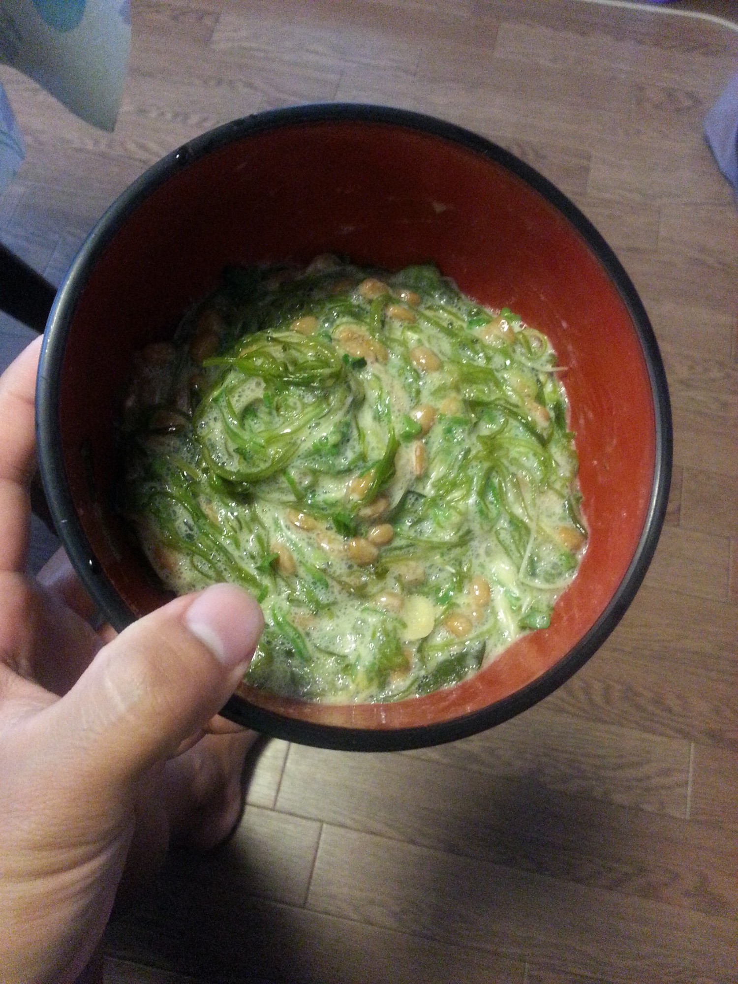 納豆、めかぶ、ねぎを混ぜて朝のエネルギーチャージ。もう何をしようが筋肥大は見込めないので、最大の評価点だと思われる『絞り』を極めるだけですね。