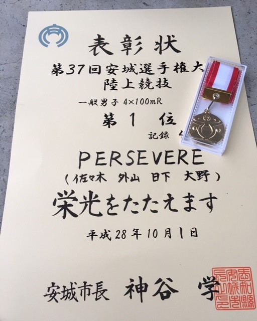 4×100mリレー優勝しました。走り幅跳びは第四位でした。
