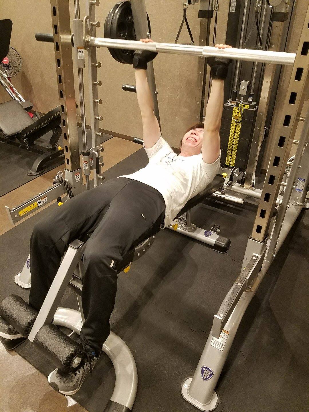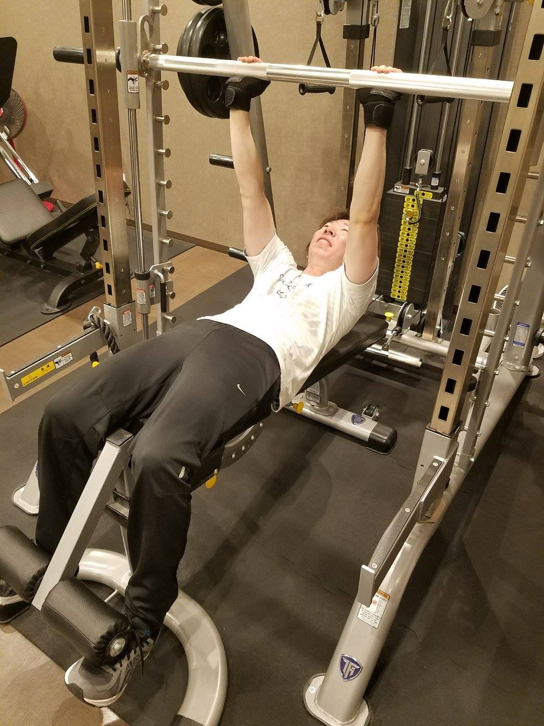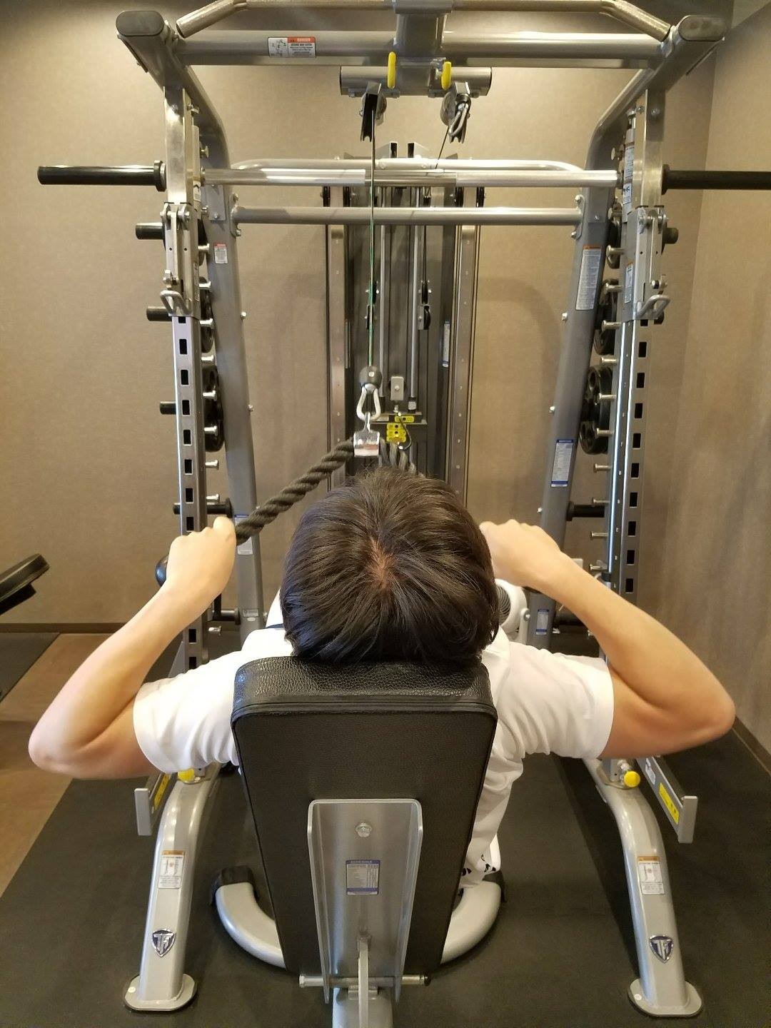バーの重みに負けないように天井に向かって押し込むだけ。簡単なようで色々なポイントがあります。
