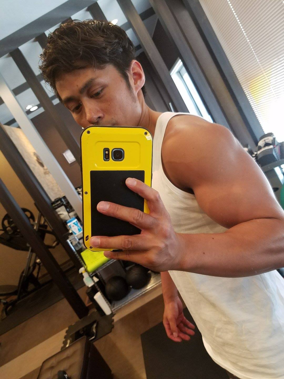 写真は連日、ハードなトレーニングを積む男性会員様!テーマは『Tシャツをかっこよく着こなす』