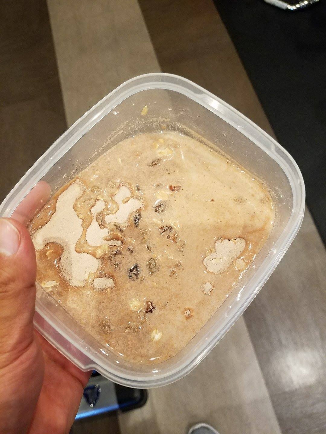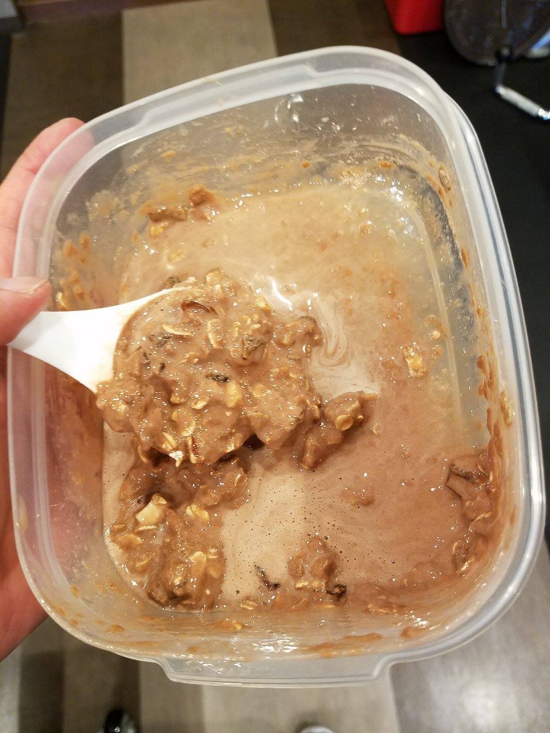 オートミールにチョコ味のプロテインを混ぜ、水を適量入れて出来上がり。調理時間一分!