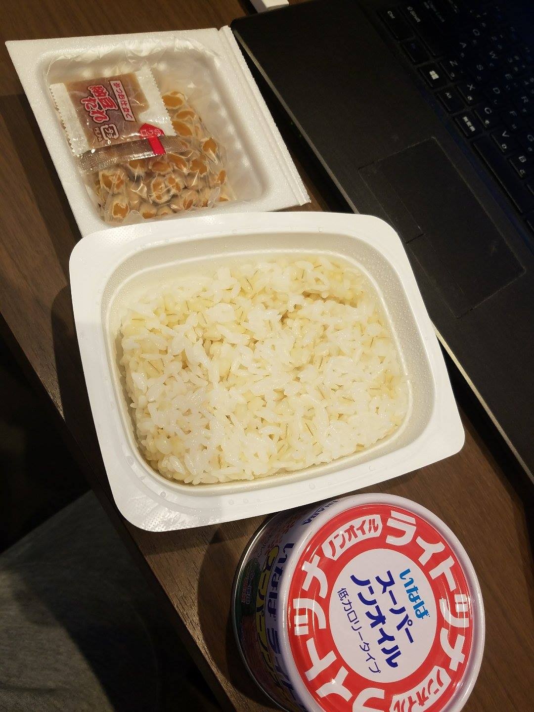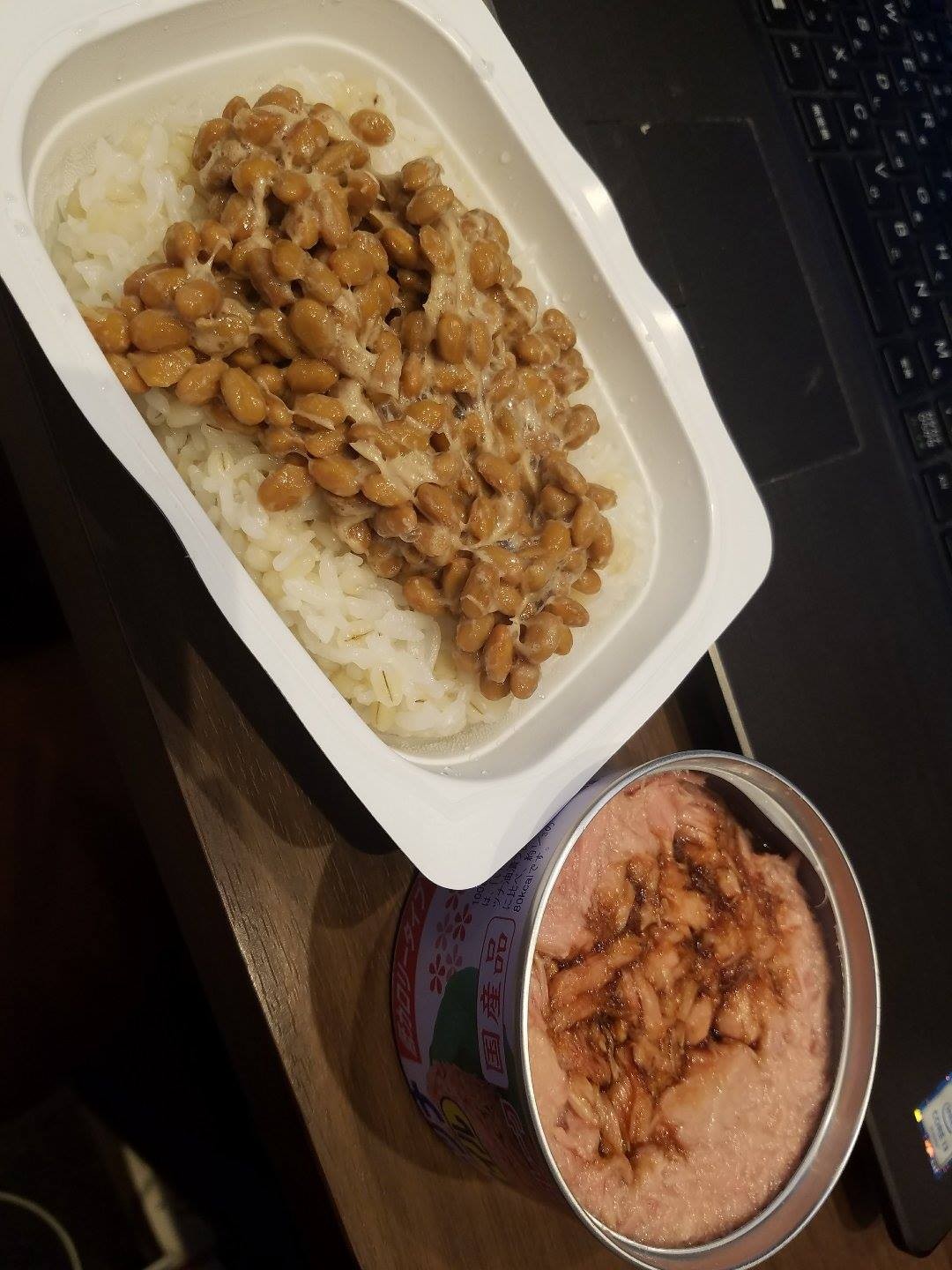 日中の僕の食事といえば、一か月くらいこのコンビです。もち麦ご飯に、納豆、ツナ缶大サイズを継続しています。